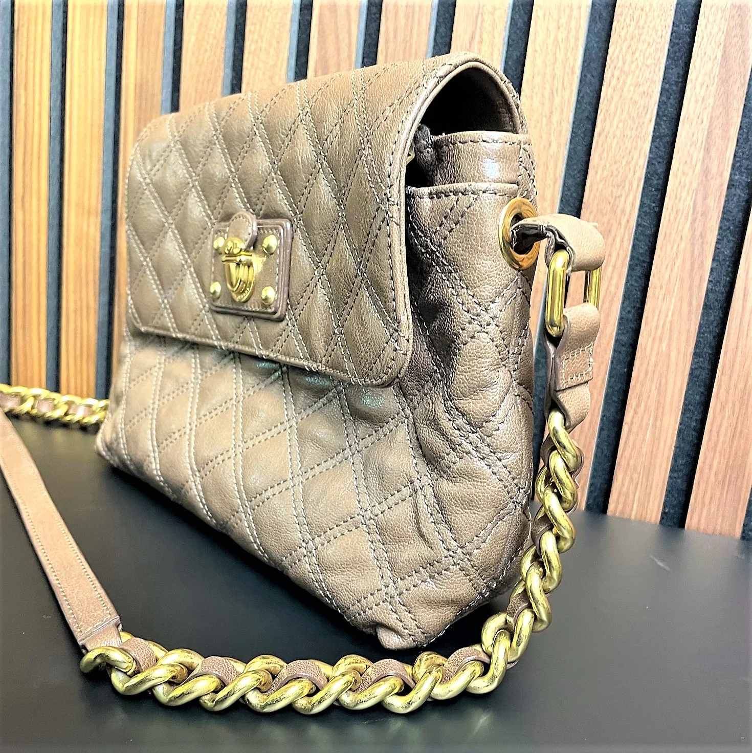 Craquez pour ce ravissant sac à main Marc Jacobs en cuir matelassé couleur taupe, parfait pour habiller n'importe laquelle de vos tenue façon chic ou décontractée